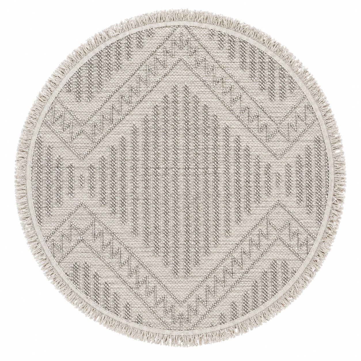 שטיח עגול בגוון שמנת עם טקסטורה גאומטרית עדינה ושוליים פרומים למראה טבעי וחמים. משתלב מושלם בעיצוב מודרני, כפרי ובוהו ומוסיף עומק ורכות לכל חלל.