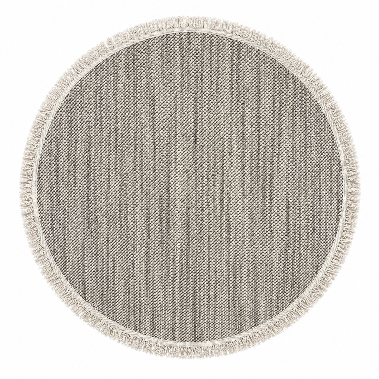 שטיח עגול בגוון אפור-שמנת במרקם אחיד ועדין עם שוליים פרומים למראה נקי ומודרני. מתאים לכל חלל ומוסיף תחושת חמימות ואלגנטיות בעיצוב מינימליסטי.